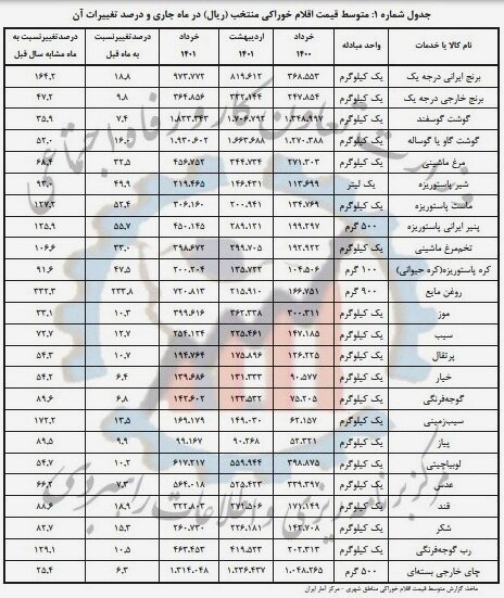 به موجب این گزارش متوسط قیمت حدود ۹۵.۸ درصد اقلام منتخب شامل برنج ایرانی و خارجی درجه یک، گوشت گاو یا گوساله، مرغ ماشینی، شیر پاستوریزه، ماست پاستوریزه، پنیر ایرانی پاستوریزه، تخم مرغ، کره پاستوریزه، ‌روغن مایع، موز، سیب و پرتقال، ‌خیار گوجه فرنگی، سیب زمینی، پیاز، لوبیاچیتی، عدس، قند، شکر، رب گوجه فرنگی و چای خارجی بسته‌ای فراتر از حد بحرانی قرار دارند که اصلاح و آزادسازی قیمتها تاحدودی موجب ایجاد شیب صعودی در اقلام خوراکی شده است.
