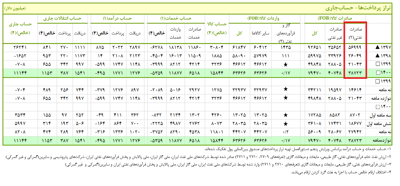 طبق گزارش جدید بانک مرکزی، میزان درآمد نفتی ایران در سال 1400 به 38 میلیارد و 723 میلیون دلار رسیده است.