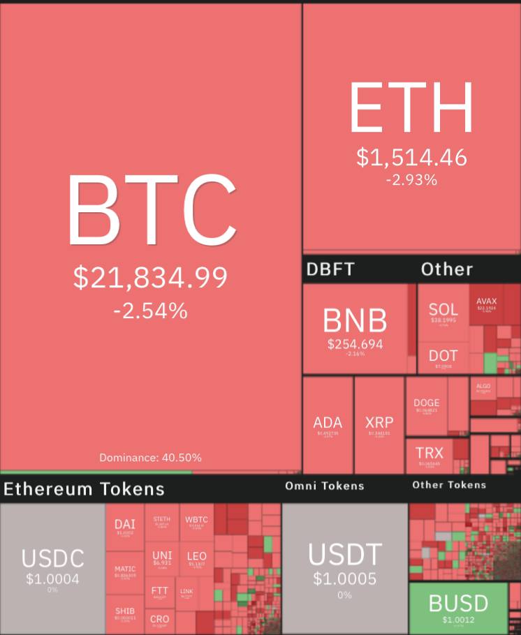 بیتکوین و اتریوم با افت حدود ۳ درصد به ترتیب به قیمت ۲۱ هزار و ۸۳۴ دلار و هزار و ۵۱۴ دلار معامله میشوند.