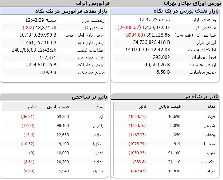 شاخص کل بورس اوراق بهادار تهران در پایان معاملات امروز با کاهش 24 هزار و 387 واحد همراه شد.