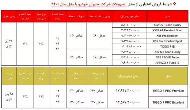از سوی دیگر تیگو 7 IE با قیمت ۱ میلیارد و ۱۰۲ میلیون و ۸۲۰ هزار تومان، ام وی ام ایکس 22 MT اسپرت لاکچری با قیمت ۴۸۷ میلیون و ۹۸۰ هزار تومان، ام وی ام ایکس 22 پرو IE توربو با قیمت ۶۴۱ میلیون و ۸۰۰ هزار تومان، آریزو 5 پرو IE نیز با قیمت ۷۶۰ میلیون و ۹۰۰ هزار تومان، تیگو ۸ پرو پریمیوم با قیمت ۱ میلیارد و ۷۹۴ میلیون و ۷۳۰ هزار تومان و تیگو ۷ پرو اکسلنت نیز با قیمت ۱ میلیارد و ۲۵۶ میلیون و ۷۲۰ هزار تومان به مشتریان عرضه خواهند شد.
