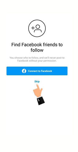 در این بخش گزینه Connect to Facebook از شما میخواهد که اگر با ایمیل ساخت حساب اینستاگرام را انجام دادهاید وارد فیسبوک شوید و به دوستانتان اطلاعرسانی کنید، اما شما در این بخش بهتر است که گزینه Skip را انتخاب کنید و از این بخش عبور کنید؛ متصل شدن به فیسبوک اختیاری است و بستگی به نظر خود شما دارد.