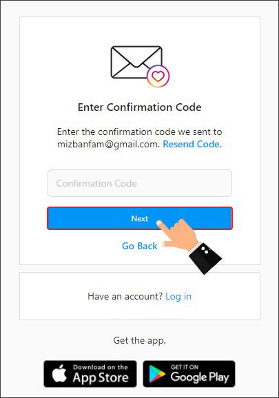 بعد از اینکه ایمیل یا شماره را وارد کردید اینستاگرام برای مطمئن شدن از صحیح بودن اطلاعات به ایمیل یا شمارهای که وارد کردهاید کد تأیید ارسال میکند و شما باید این کد را در این قسمت که در تصویر برای شما دوستان مشخص کردیم وارد کنید تا اپلیکیشن متوجه شود اطلاعات صحیح است و به شما اجازه دهد با انتخاب گزینه Next به ساخت اکانت ادامه دهید.