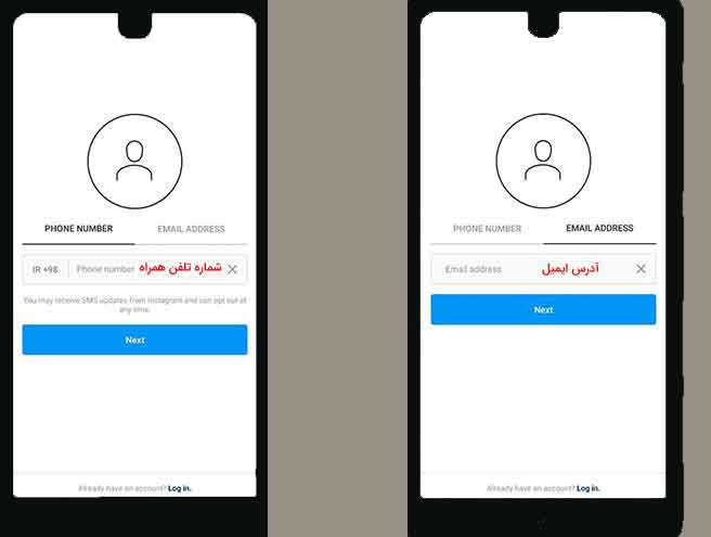 اگر قصد دارید اکانتتان را با ایمیل بسازید باید گزینه Email address را انتخاب کنید و اگر میخواهید صفحه اینستاگرامتان بر روی شمارهتلفنتان فعال شود گزینه Phone number را انتخاب کنید و بعد اطلاعات موردنیاز را وارد کنید و در آخر بر روی دکمه Next ضربه بزنید.