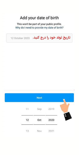 بعد از انتخاب یکی از گزینهها صفحهای به شما نمایش داده میشود برای انتخاب تاریخ تولد، به این نکته توجه کنید، افراد زیر ۱۳ سال حق ندارند از اینستاگرام استفاده کنند، در این بخش باید سال تولدتان را به میلادی وارد کنید.