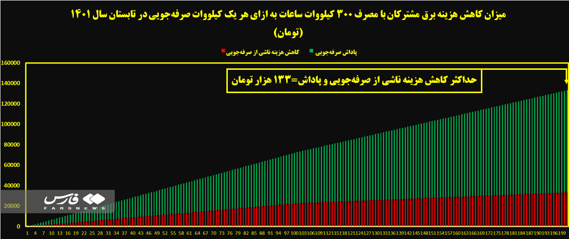 از سوی دیگر با کاهش هر کیلووات ساعت صرفهجویی با توجه به اینکه میزان ۳۰۰ کیلووات ساعت به عنوان عدد اوج بار مشخص شده است، ۵۰۰ تومان به عنوان پاداش صرفهجویی دریافت خواهد شد.