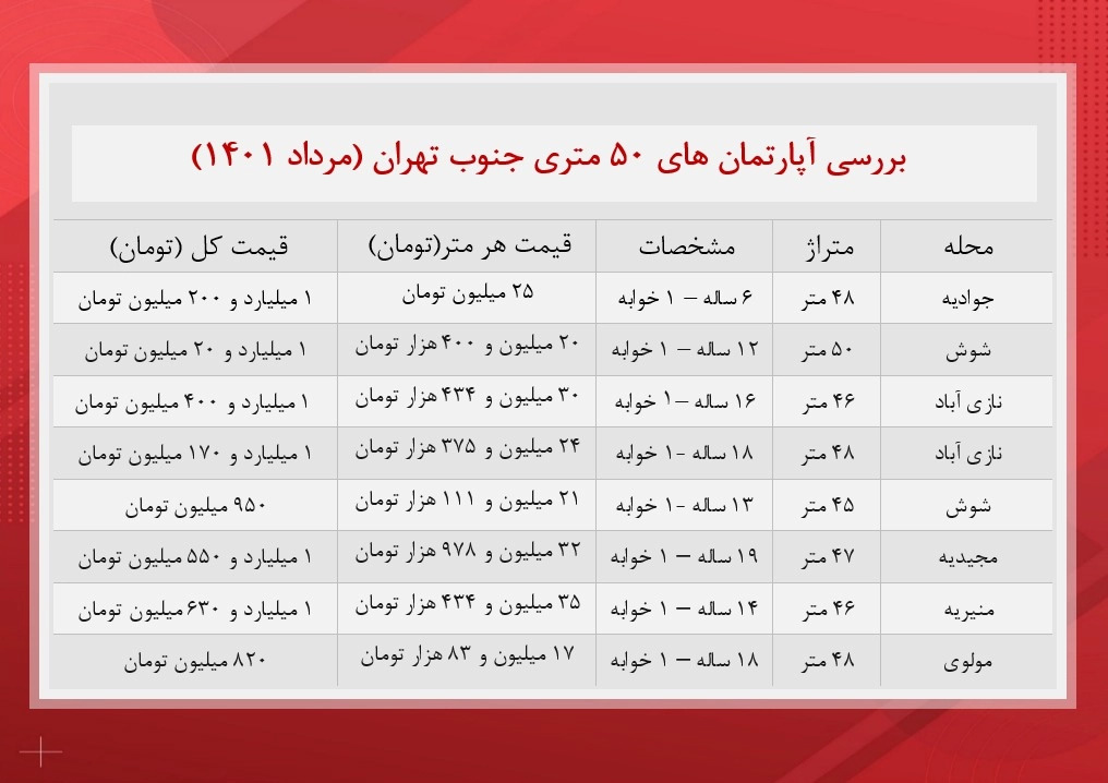 در گزارش زیر به بررسی قیمت و مشخصات آپارتمانهای ۵۰ متری جنوب تهران خواهیم پرداخت.