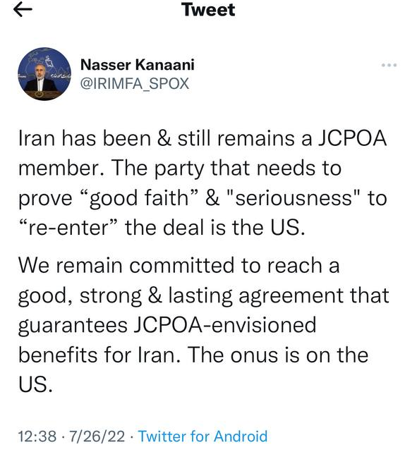به گزارش سایت طلا، ناصر کنعانی سخنگوی وزارت امور خارجه امروز (سهشنبه) چهارم مرداد ماه در واکنش به ادعاهای همتای آمریکایی در توئیتر نوشت: جمهوری اسلامی ایران در برجام بوده و هست، طرفی که برای بازگشت، باید حسن نیت و التزام خود را ثابت کند، دولت آمریکا است.