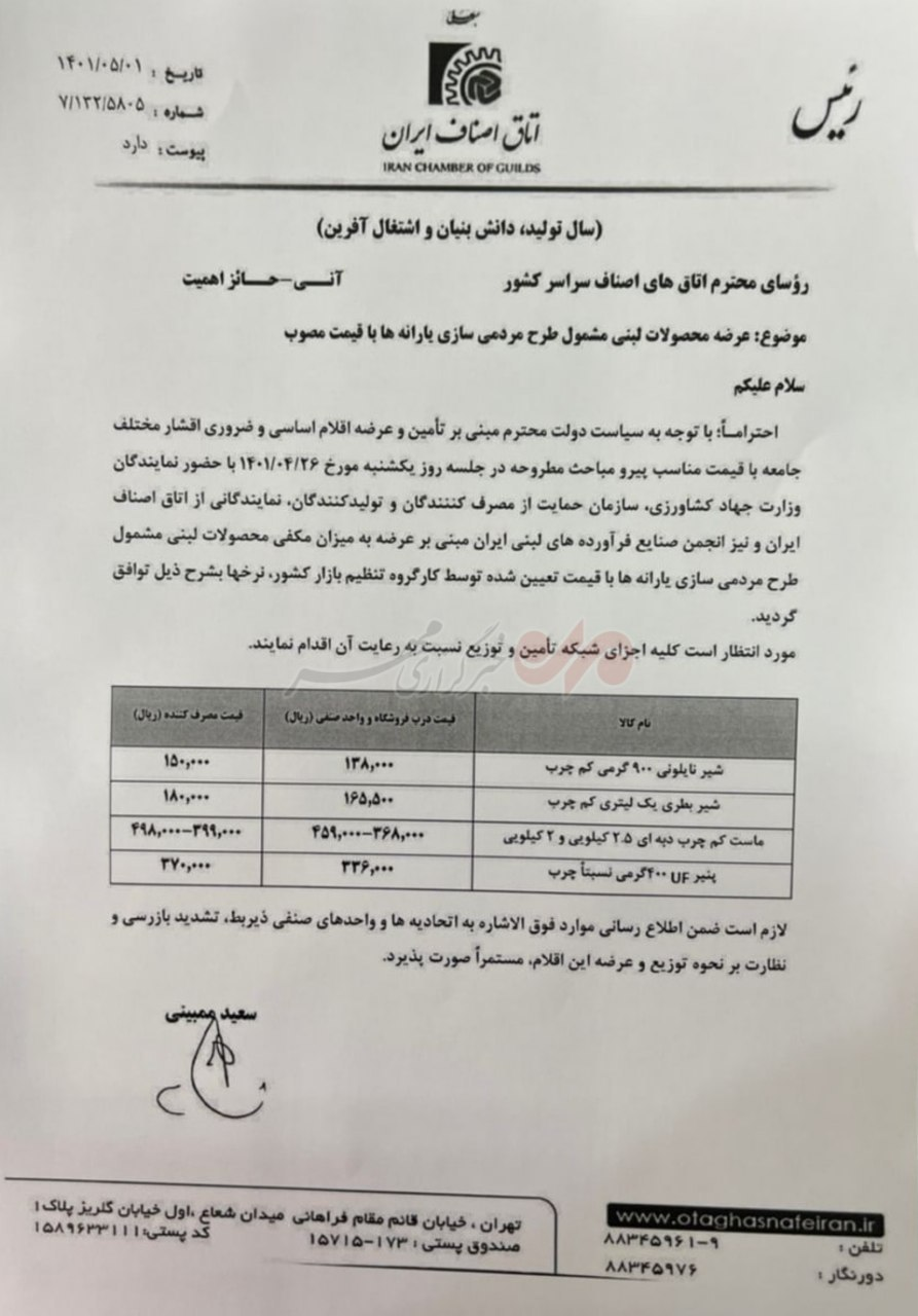 در متن این نامه آمده است: احتراماً با توجه به سیاست دولت مبنی بر تأمین و عرضه اقلام اساسی و ضروری اقشار مختلف جامعه با قیمت مناسب پیرو مباحث مطروحه در جلسه روز یکشنبه ۲۶ تیر ماه سال ۱۴۰۱، با حضور نمایندگان وزارت جهاد کشاورزی، سازمان حمایت مصرف کنندگان و تولیدکنندگان، نمایندگانی از اتاق اصناف ایران و نیز انجمن صنایع فرآوردههای لبنی ایران مبنی بر عرضه به میزان مکفی محصولات لبنی مشمول طرح مردمی سازی یارانهها با قیمت تعیین شده توسط کارگروه تنظیم بازار کشور، نرخها به شرح ذیل توافق گردید.
