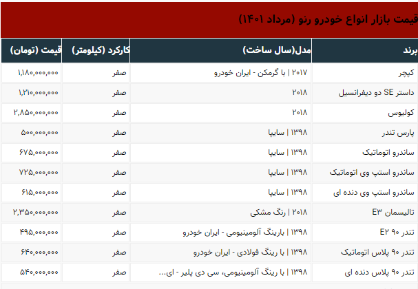 در جدول زیر قیمت روز انواع رنو را در بازار مشاهده می‌کنید