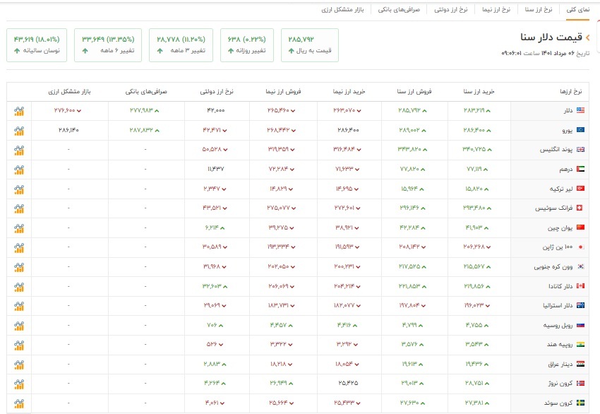 نرخ خرید و فروش هر دلار در بازار سنا، به ترتیب ۲۸۳ هزار و ۲۱۹ و ۲۸۵ هزار و ۷۹۲ ریال و نرخ خرید و فروش هر یورو در این بازار به ترتیب ۲۸۶ هزار و ۴۰۰ و ۲۸۹ هزار و ۲ ریال بود.