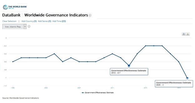بانک جهانی کارآمدی دولتهای گذشته ایران از سال ۱۹۹۶ (۱۳۷۵) تا ۲۰۲۰ (۱۳۹۹) را بررسی کرده که کمترین نمره از آن دولت دوازدهم در سال ۲۰۲۰ شده است.