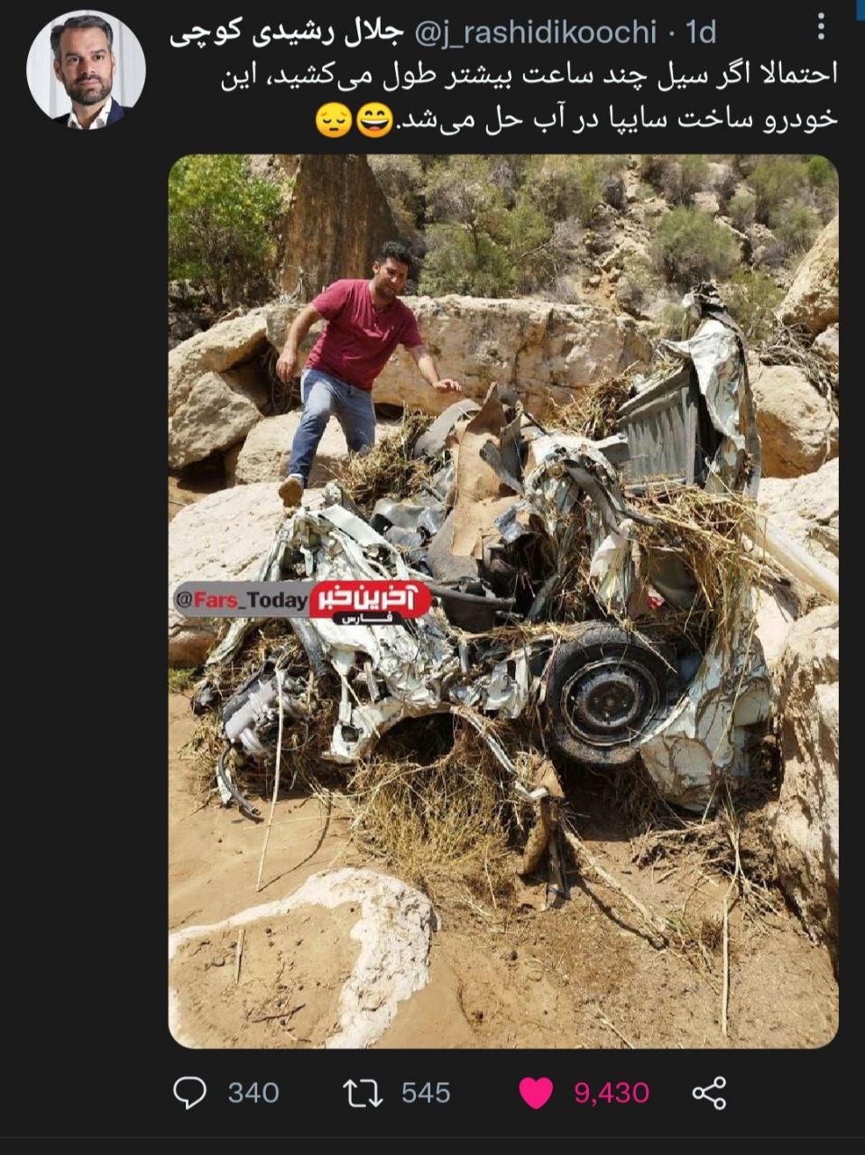 نماینده مرودشت و پاسارگاد با انتشار عکسی از یک پراید به شدت له شده در سیل استهبان در حساب کاربری خود در توییتر نوشت: احتمالا اگر سیل چند ساعت بیشتر طول میکشید، این خودرو ساخت سایپا در آب حل میشد.