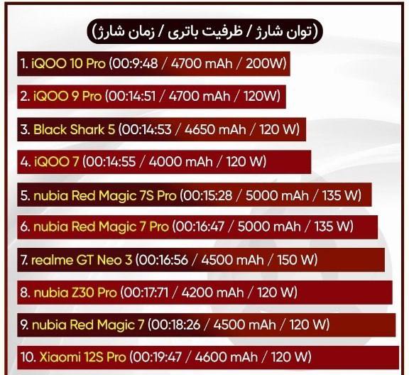 اسامی ۱۰ گوشی هوشمند با بیشترین سرعت شارژ را در تصویر زیر ببینید.
