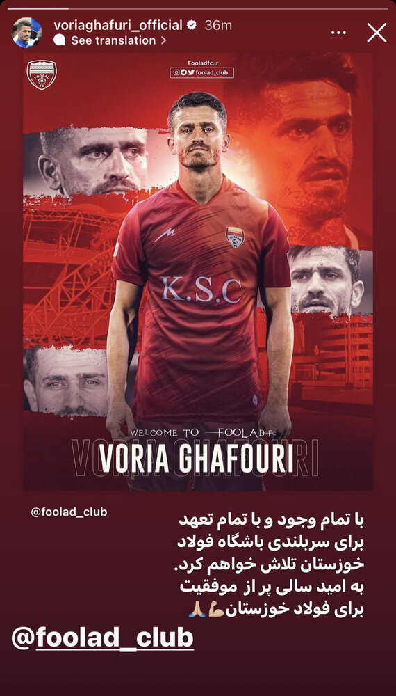 او پس از رسمی شدن انتقالش به فولاد با انتشار یک استوری گفت که با تمام تعهد برای سربلندی فولاد تلاش خواهد کرد.