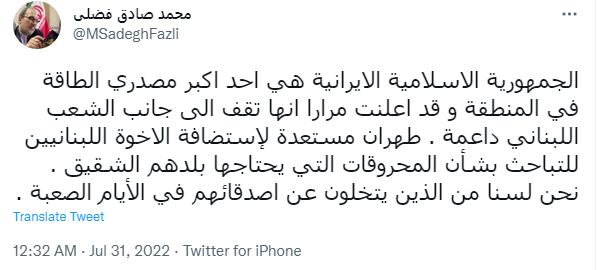 به گزارش سایت طلا ، «محمدصادق فضلی» دستیار وزیر امور خارجه و مدیرکل غرب آسیا و شمال آفریقای وزارت امور خارجه در توئیتی نوشت: جمهوری اسلامی ایران بهعنوان یکی از بزرگترین تولید و صادرکنندگان انرژی در منطقه، برای کمک به مردم لبنان، در کنار آنها ایستاده است.