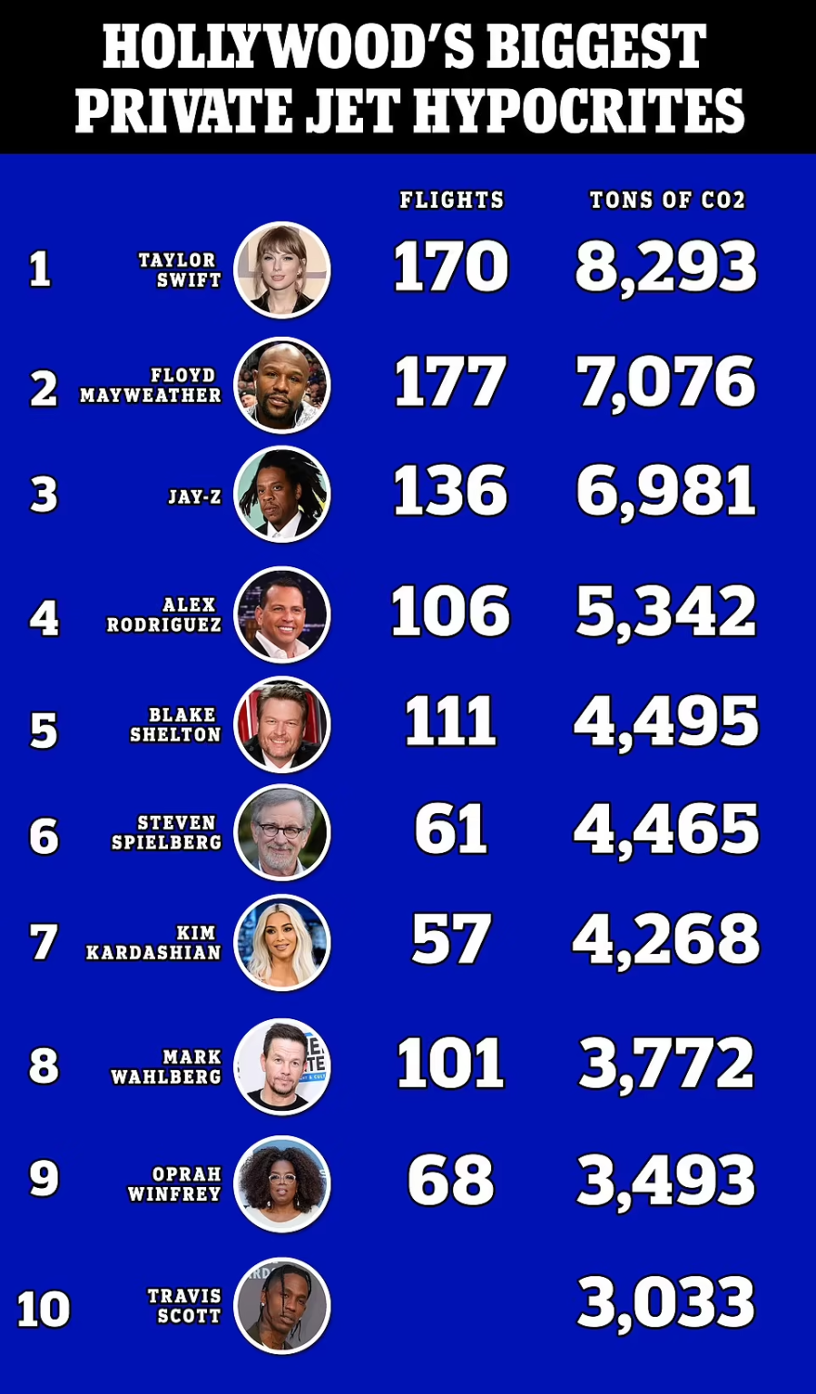 ر جایگاه سوم رپر Jay-Z قرار گرفت که جتش در ۱۳۶ پرواز ۶۹۸۱.۳ تن CO2 منتشر کرد. الکس رودریگز بازیکن بازنشسته بیسبال با ۵۳۴۲.۷ تن آلایندگی در رتبه چهارم قرار گرفت.