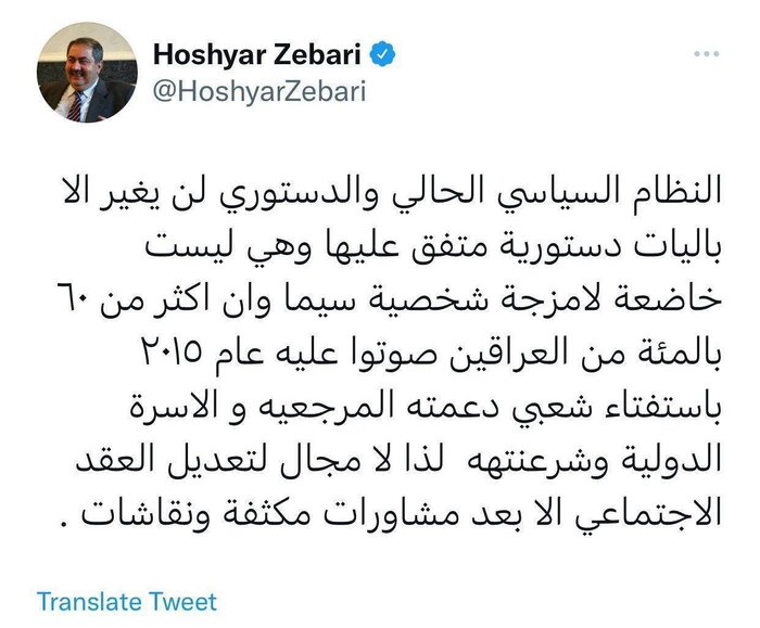 به گزارش سایت طلا به نقل از پایگاه خبری شفق نیوز، «هوشیار زیباری» در توییتی نوشت: نظام سیاسی کنونی و قانون اساسی تنها از طریق یک سری سازوکارهای قانون اساسی که مورد توافق قرار گیرد، قابل تغییر است و تابع خلق و خوی شخصی نیست.