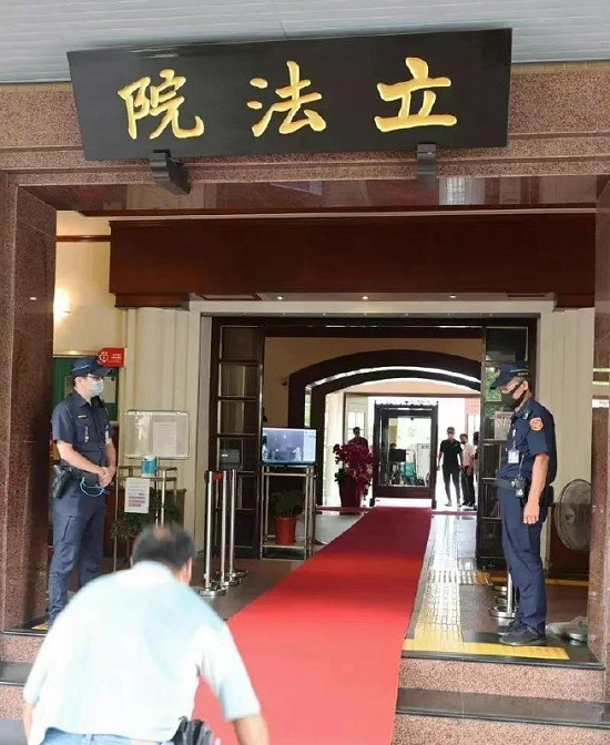تصویری از خدمه تایوانی در حال پهن کردن فرش قرمز در ورودی پارلمان این کشور