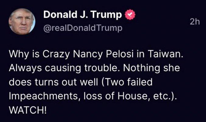 وی با اشاره به شکست دموکرات‌ها در دو بار استیضاح خودش، در این‌باره نوشت: «چرا این نانسی پلوسیِ دیوانه به تایوان رفته است. همیشه دردسرساز است. هیچکدام از کارهای او درست انجام نمی‌شود (دو استیضاح شکست خورده، از دست دادن مجلس نمایندگان غیره). حالا ببینید!»