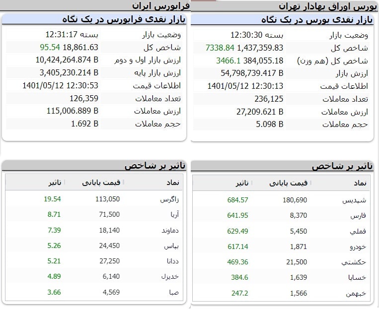 در آن سوی بازار سرمایه شاخص کل فرابورس با ۹۵ واحد افزایش به رقم ۱۸ هزار و ۸۶۱ واحد رسید. در این بازار ۱۲۶ هزار معامله به ارزش ۱۱۵ هزار و ۱۱۵ میلیارد ریال انجام شد. پتروشیمی زاگرس، پلیمر آریاساسول، تولید نیروی برق دماوند، بیمه پاسارگاد، داروسازی دانا، بهمن دیزل و سرمایه گذاری صبا تامین نسبت به سایر نمادها بیشترین تاثیر مثبت را روی فرابورس گذاشتند.