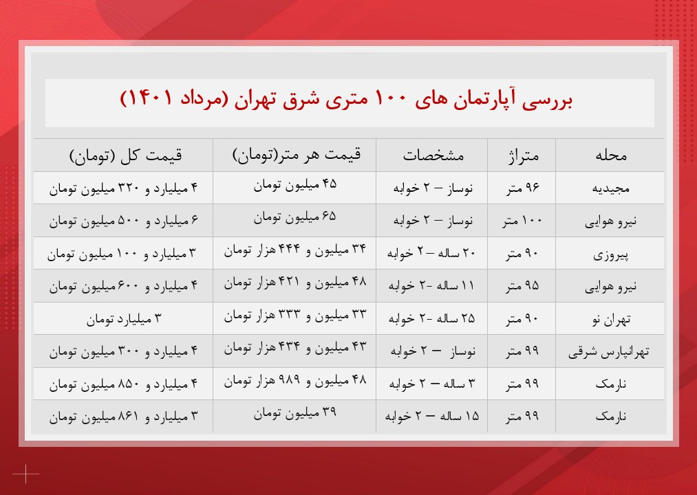 در گزارش زیر به بررسی قیمت و مشخصات آپارتمانهای ۱۰۰ متری شرق تهران خواهیم پرداخت.