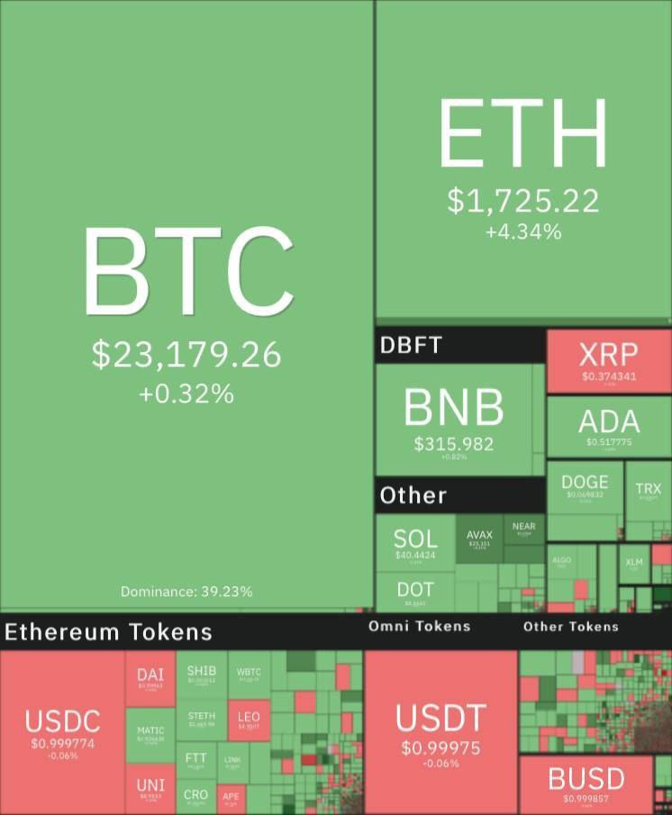 بیتکوین با رشد جزئی به قیمت ۲۳ هزار و ۱۷۹ دلار و اتریوم با افزایش بیش از ۴ درصد به قیمت هزار و ۷۲۵ دلار معامله میشوند.
