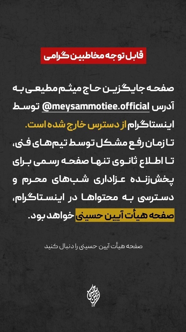 هیئت آیین حسین بعد از این اقدام اینستاگرام، در پیامی، صفحه اینستاگرام هیئت آیین حسینی را به صورت موقت جایگزین صفحه میثم مطیعی کرده است.