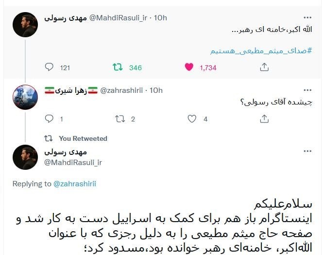 گفتنی است، شب چهارم محرم، رجزی با عنوان «الله اکبر، خامنهای رهبر» در هیئت آیین حسینی توسط حاج میثم مطیعی خوانده شد که این رجز با محوریت تجدید بیعت محور مقاومت و نابودی رژیم صهیونیستی توسط دو شاعر انقلابی محمدمهدی سیار و نور املی از لبنان سروده شده بود که باعث عصبانیت اینستاگرام شده و صبح روز گذشته، برای چندمین بار، صفحه میثم مطیعی را مسدود کرد.