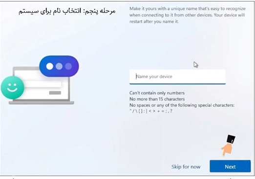 در مرحله بعد وقت آن رسیده تا نامی برای کامپیوتر خود انتخاب کنید، نام مورد نظر خود را در فیلد مشخص شده نوشته و به مرحله بعد بروید، درصورتیکه الان تمایلی به انتخاب نام دستگاه ندارید میتوانید با فشردن دکمه skip for now از این مرحله گذر کنید.