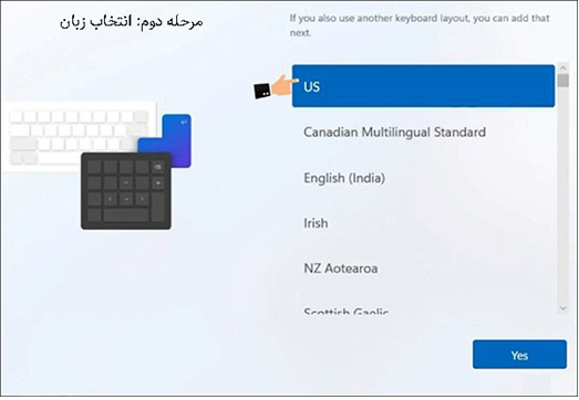 در مرحله بعد باید زبان ویندوز را انتخاب کنید، به علت نبود زبان فارسی بهعنوان پیشفرض بهتر است که زبان US را انتخاب کرده و بر روی دکمه yes کلیک کنید.