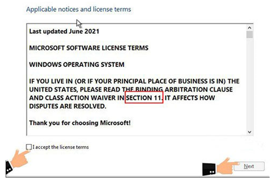پس از آن صفحه نکات و مقررات مایکروسافت باز میشود که شما باید حتماً با این مقررات موافقت کنید، بنابراین تیک I accept the license terms را بزنید و روی دکمه next کلیک کنید.