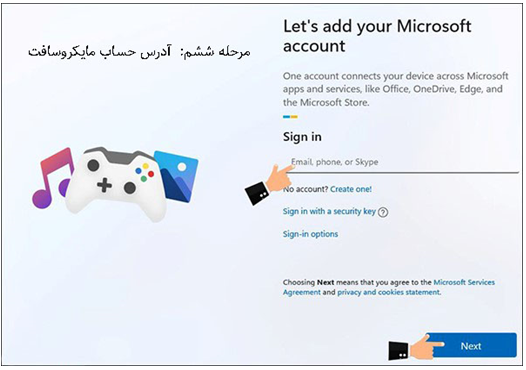 در مرحله بعد شما نیاز دارید که اکانت مایکروسافت خود را به ویندوز وصل کنید، درصورتیکه اکانت مایکروسافت دارید با استفاده از فیلد sighn-in وارد اکانت خود شوید در غیر این صورت بر روی create an account کلیک کرده و یک اکانت مایکروسافت برای خود بسازید.