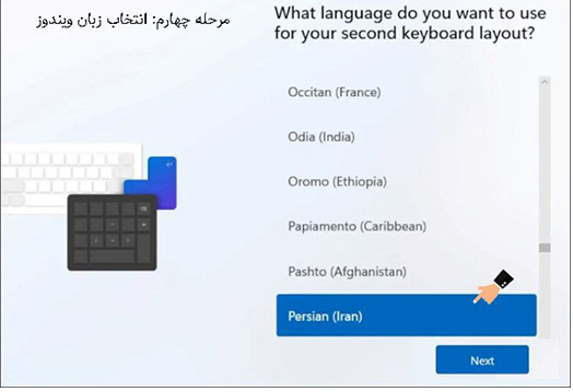 پس از آن پنجرهای جدید باز میشود که لیست زبانهای موجود مایکروسافت در آن وجود دارد، به دنبال گزینه Persian (iran) بگردید و روی آن کلیک کنید، همچنین شما قادر هستید که هر زبان دیگر که دوست دارید به ویندوز خود اضافه کنید و سپس بر روی دکمه next کلیک کنید.