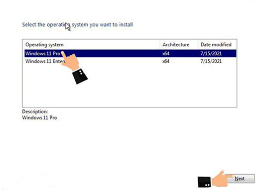 پس از آن پنجره جدید برای شما باز خواهد شد که باید نسخه ویندوز موردنیاز خود را انتخاب کنید، ویندوز 11 دارای نسخههای متفاوتی است که هرکدام برای کار خاصی مناسب است، برای مثال مدل windows 11 home برای سیستمهای خانگی مناسب است، پس از انتخاب مدل ویندوز روی دکمه next کلیک کنید.