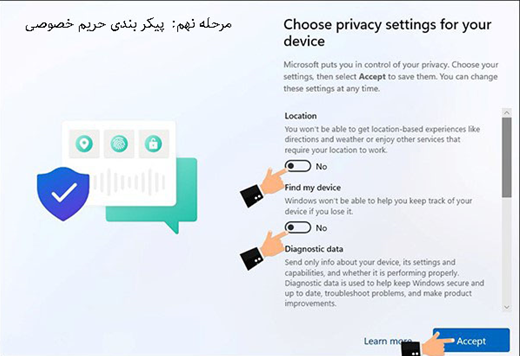 در مرحله بعد نوبت به آن میرسد تا حریم خصوصی خود را پیکربندی کنید، در ابتدا پیشنهاد میشود تا تمامی المانها را غیرفعال نگه داشته و با زدن دکمه accept مراحل تنظیمات ویندوز 11 را به اتمام برسانید.