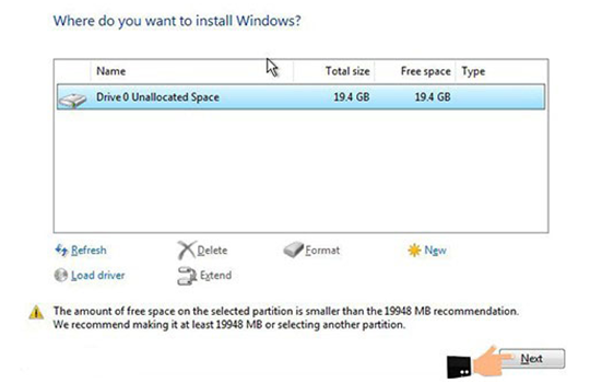 در مرحله بعد صفحه پارتیشنبندی ویندوز باز خواهد شد، پس از پارتیشنبندی درایو موردنظر خود برای نصب ویندوز را انتخاب کنید، در صورتی که میخواهید از درایو قبلی جهت نصب ویندوز جدید استفاده کنید ابتدا باید درایو خود را فرمت کرده و دکمه next را فشار دهید.