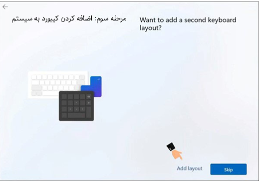 در مرحله بعدی نوبت به تنظیم کیبورد میرسد، درصورتیکه میخواهید که کیبورد فارسی را به سیستم خود اضافه کنید بر روی دکمه add layout کلیک کنید.