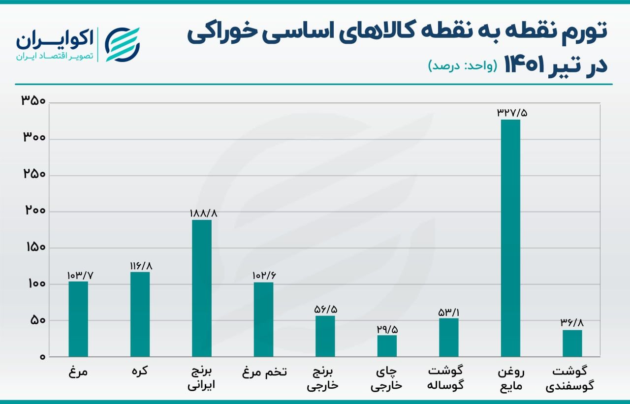 تورم نقطه به نقطه روغن مایع در تیر ماه 327.5 درصد برآورد شده، به بیان دیگر قیمت روغن در تیر امسال نسبت به تیر سال گذشته 4.3 برابر شده است. این تورم بالاترین تورم رقم خورده در میان تمامی کالا های اساسی محسوب می شود، در جایگاه دوم نیز روغن جامد قرار دارد. بررسی ها نشان اوج گرانی روغن متآثر از چند ماه اخیر بوده و با سیاست حذف ارز ترجیحی این اتفاق رخ داده است. البته با توجه به اینکه اوکراین و روسیه تامین کننده قسمت عمده از نیاز دانه های روغنی جهان هستند، جنگ میان این دو کشور باعث شده تا تولید روغن با مشکل مواجه شود و قیمت این کالا افزایش یابد.