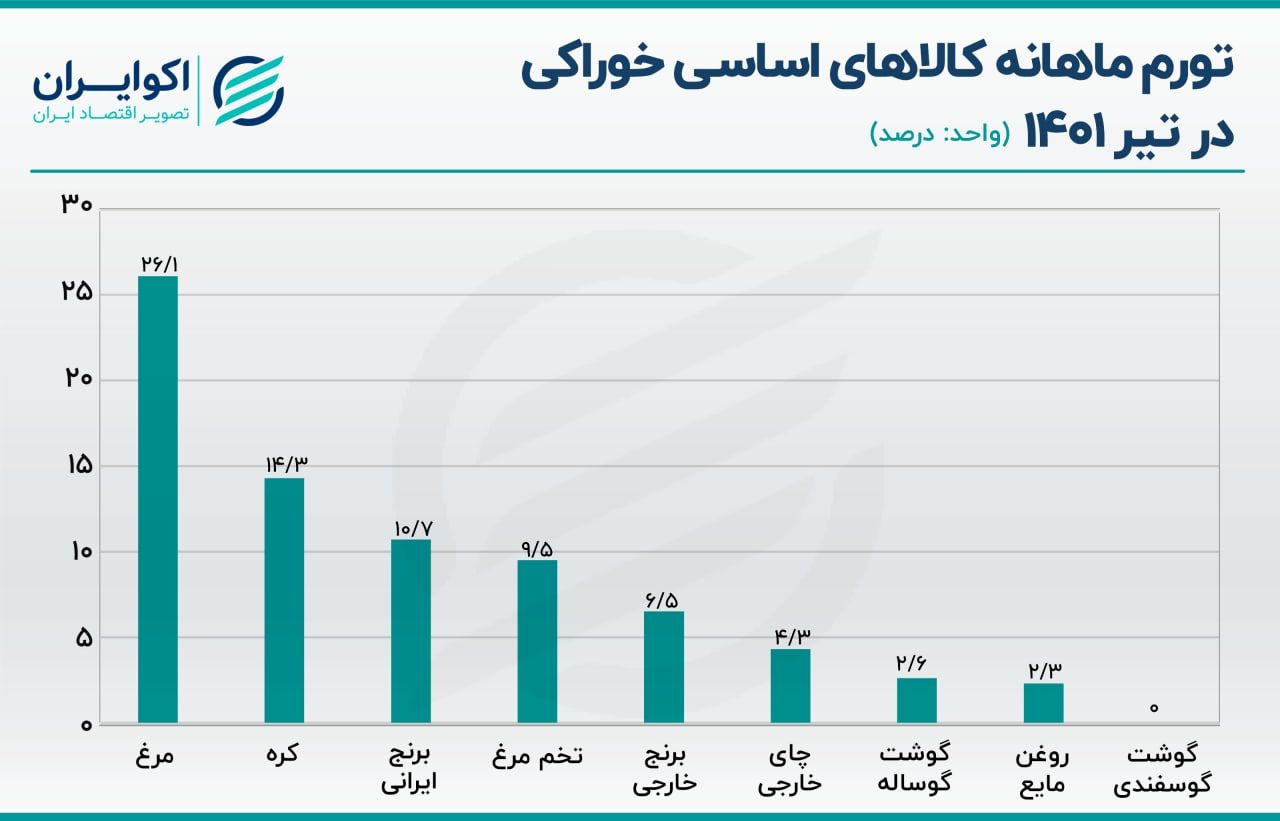 رشد قیمت مرغ ماشینی در تیر ماه 26.1 درصد برآورد شده که بالاترین رشد ماهانه قیمت در بین کالاهای اساسی خوراکی محسوب می شود، این در حالیست که تورم گوشت قرمز گوسفندی در ماه گذشته صفر درصد بوده و این کالا هیچگونه افزایش قیمتی را تجربه نکرده است. کره پاستوریزه نیز در تیر ماه افزایش قیمت بالایی را تجربه کرده و تنها در یکماه به طور میانگین این قلم 14.3 درصد گران تر شده است. برنج ایرانی نیز در ماه گذشته بالغ بر 10 درصد افزایش قیمت داشته است.