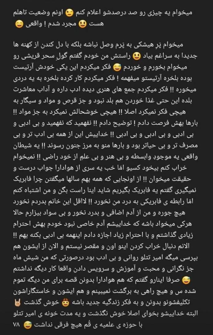 تتلو در ادامه توییت هایش نوشته است: فکر کردم کار کرده بالاخره به ی دردی میخوره فکر میکردم جمع هنری دیده ادب داره و آداب معاشرت بلده این جتی غذا خوردن هم بلد نبود و جز قرص و مواد و سیگار به هیچی فکر نمیکرد اصلا هیچی خوشحالش نمیکرد جز مواد! میخوام ی چیزی رو صددرصدشو اعلام کنم اونم وضعیت تاهلم هست مجرد شدم واقعی
