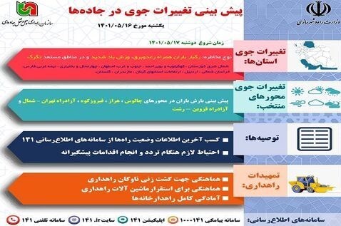 در اطلاعیه سازمان راهداری و حمل و نقل جادهای، از کاربران جادهای و مسافران خواسته شده است ضمن کسب آخرین اطلاعات وضعیت راهها از سامانههای اطلاع رسانی 141، هنگام تردد احتیاط لازم را داشته و اقدامات پیشگیرانه را انجام دهند.