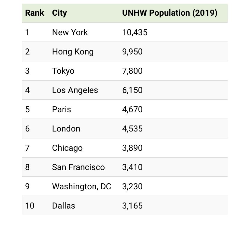 در آخر، ذکر این نکته ضروری است که این داده ها مربوط به سال ۲۰۱۹، قبل از همه گیری جهانی است و از آنجایی که جمعیت UHNW از تاثیر اقتصادی COVID-19 مصون نبوده است، جالب است که ببینیم کدام شهرها در سال آینده رتبه بندی را بر اساس ارقام سال ۲۰۲۰ تشکیل میدهند. »