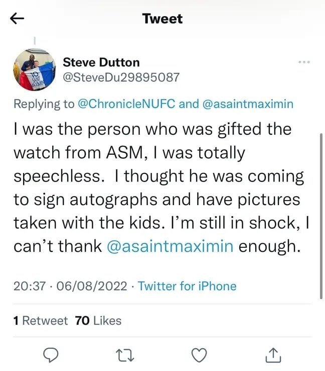 آلن سنماکسیما، ستاره تیم نیوکاسل پس از درخشش در اولین بازی فصل مقابل ناتینگهام فارست به یکی از هواداران نیوکاسل که پرچم فرانسه با نام و شماره او در دست داشت، یک ساعت رولکس هدیه داد.