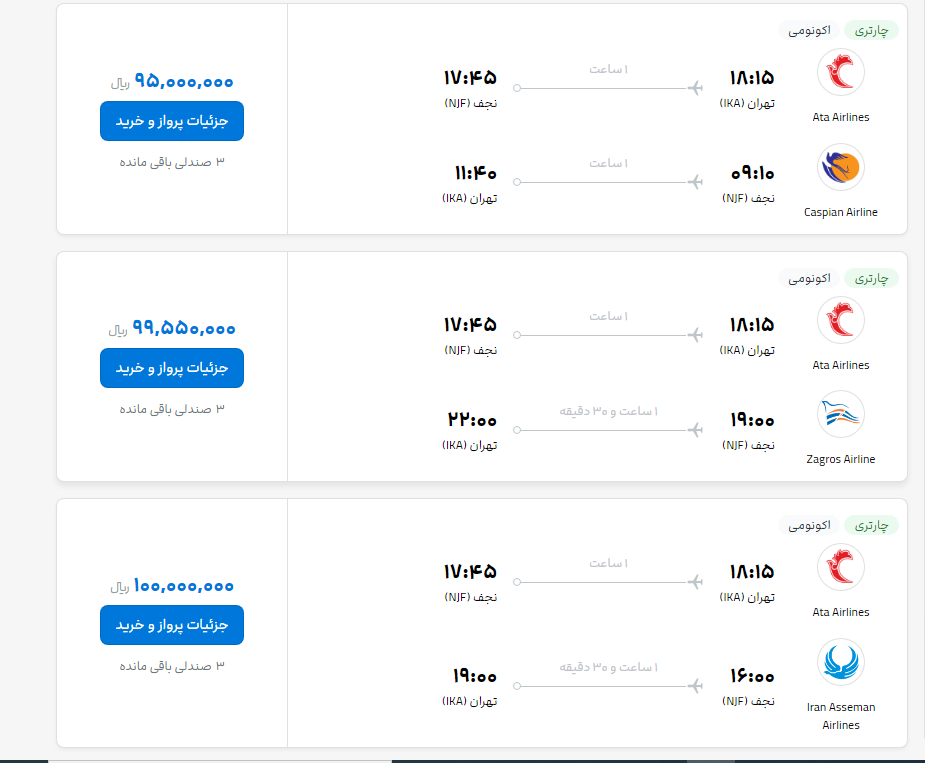 به طوری که بررسی های میدانی حاکی از آن است که هم اکنون قیمت بلیت پروازهای نجف به 10 میلیون تومان رسیده و بسیاری از مسافران در این هفته برای تردد به نجف برای رفت وبرگشت باید 10 میلیون تومان هزینه کنند. این در حالی است که تمامی این پروازهای از طریق ایرلاین های داخلی انجام می شود.