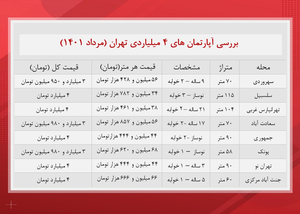 در گزارش زیر به بررسی قیمت و مشخصات آپارتمانهای ۴ میلیاردی تهران خواهیم پرداخت.