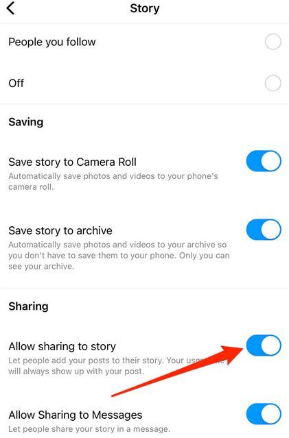 مرحله ۴: در بخش " Sharing"، روی دکمه آبی سمت راست " Allow sharing to story" ضربه بزنید تا دیگر کاربران نتوانند پستهای شما را در استوری اینستاگرام خود به اشتراک بگذارند.