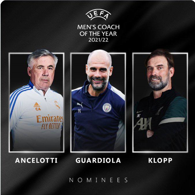 در بخش سرمربیان هم، کارلو آنچلوتی سرمربی رئال مادرید، پپ گواردیولا سرمربی منچستر سیتی و یورگن کلوپ سرمربی لیورپول حضور دارند.
