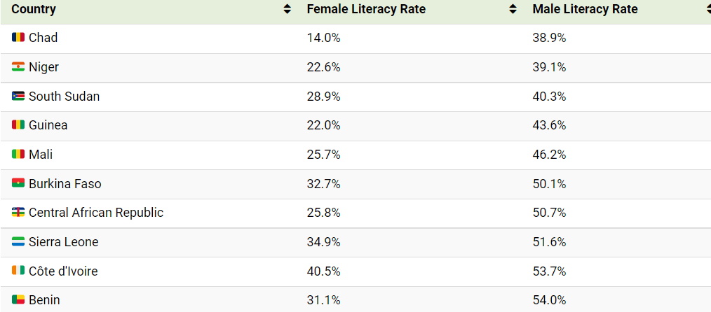 همانطور که دادهها نشان میدهد تعداد خیرهکنندهای از جمعیت بی سوادهای جهان در جنوب صحرای بزرگ آفریقا هستند. کشوری که کمترین میزان سواد را در این دادهها به خود اختصاص داده چاد است که در آن تنها ۱۴ درصد زنان و ۳۸.۹ درصد مردان باسواد هستند. یکی از دلایل این امر دسترسی ضعیف ساکنین این کشور به آموزش است. در سال ۲۰۱۹ بیش از ۷۰۰ هزار کودک به مدرسه نرفتند که حدود ۵۰۰ هزار نفر از آنها دختر بودند.