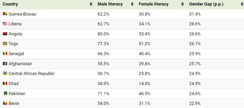 کشورهای شمال آفریقا، جنوب صحرای آفریقا، آسیای غربی و آسیای جنوبی هنوز تفاوت های قابل توجهی بین جنسیت نشان میدهند. گینه بیسائو در غرب آفریقا دارای بیشترین شکاف سواد جنسیتی است و نرخ سواد در مردان ۳۱.۴ درصد بیشتر از زنان است. یکی از دلایل احتمالی این شکاف، نرخ بالای ازدواج کودکان در این کشور است. زیرا تقریبا ۳۷ درصد از زنان قبل از ۱۸ سالگی ازدواج کردهاند.